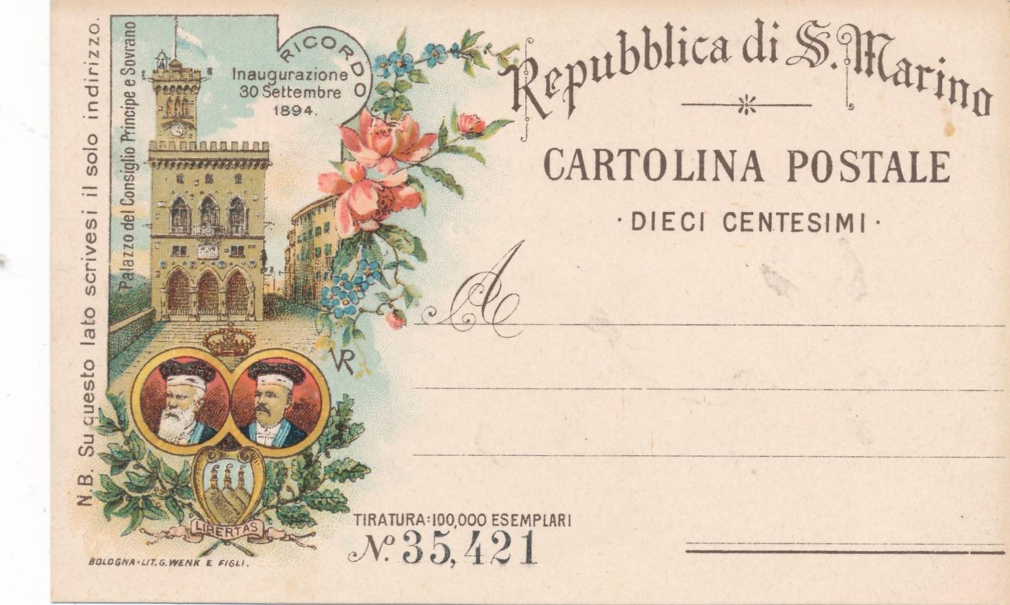San Marino 1894 Postkarte DIECE CENTESIMI, Repubblica, postalisch nicht gelaufen