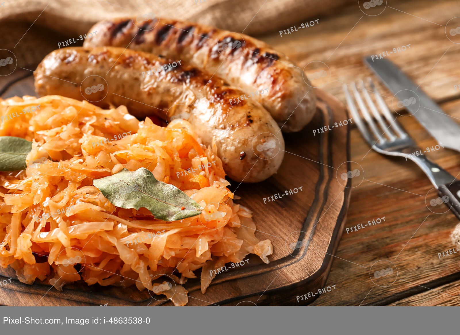 Tasty sauerkraut with grilled sausages on wooden board :: Stock Photography Agen